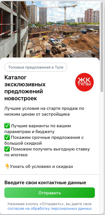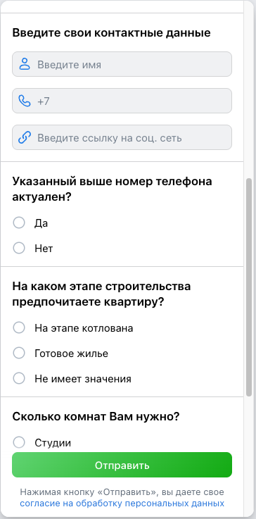В качестве посадочной страницы использована лид-форма VK, которая позволяла быстро получить контактные данные пользователя после перехода по объявлению.