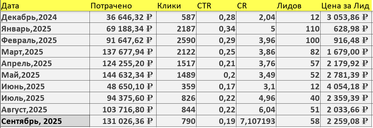 Итоговые показатели за 9 месяцев работы с клиентов приведены в таблице ниже. Стоит отметить существенную разницу в количестве и стоимости за лид в Январе и Феврале 2025 года, которая связана с общим снижением конкуренции и активности рекламодателей в этот период на площадках VK.